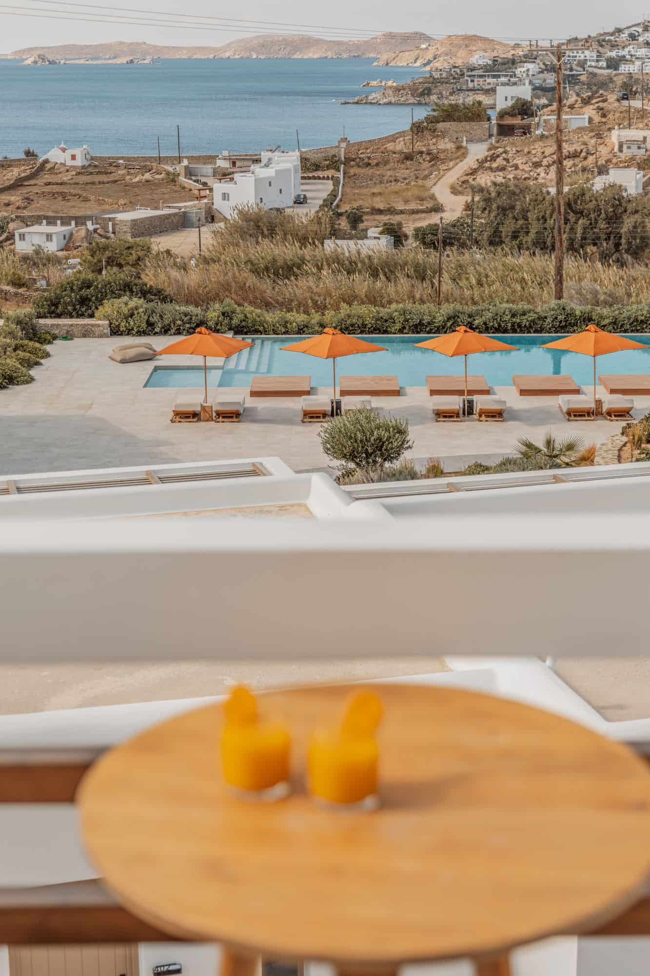 Stunning outdoor pool at Aelo Mykonos overlooking the Aegean Sea with vibrant orange umbrellas and lush landscaping.