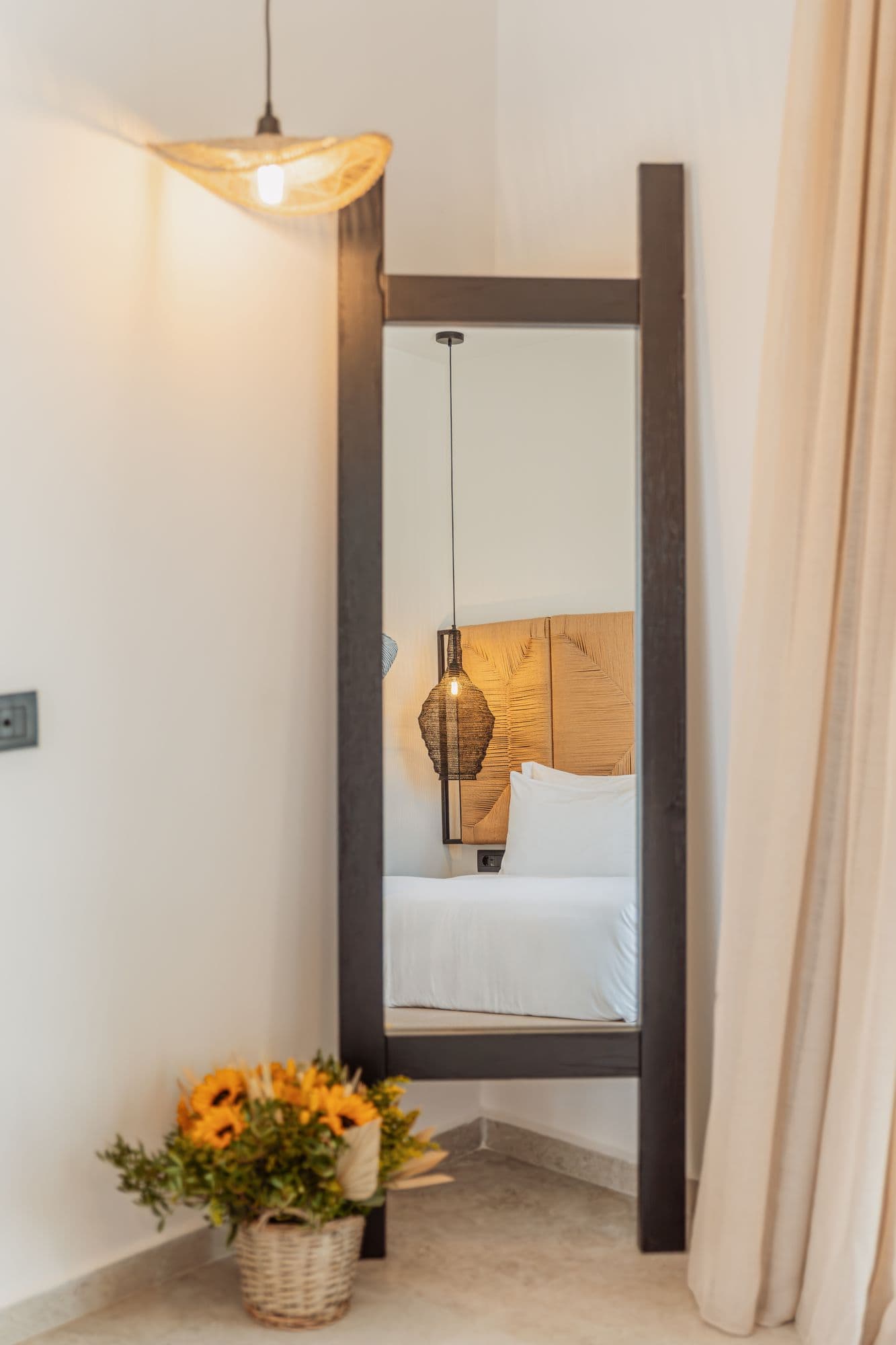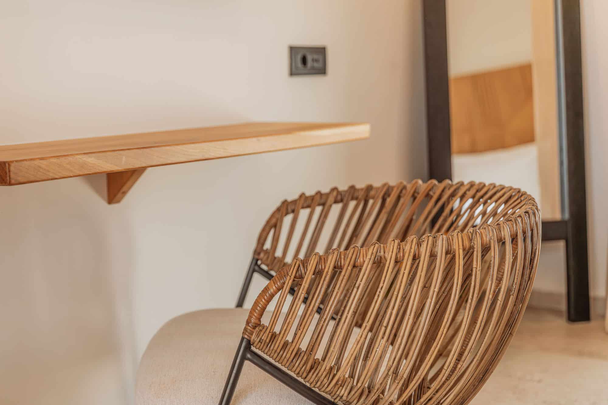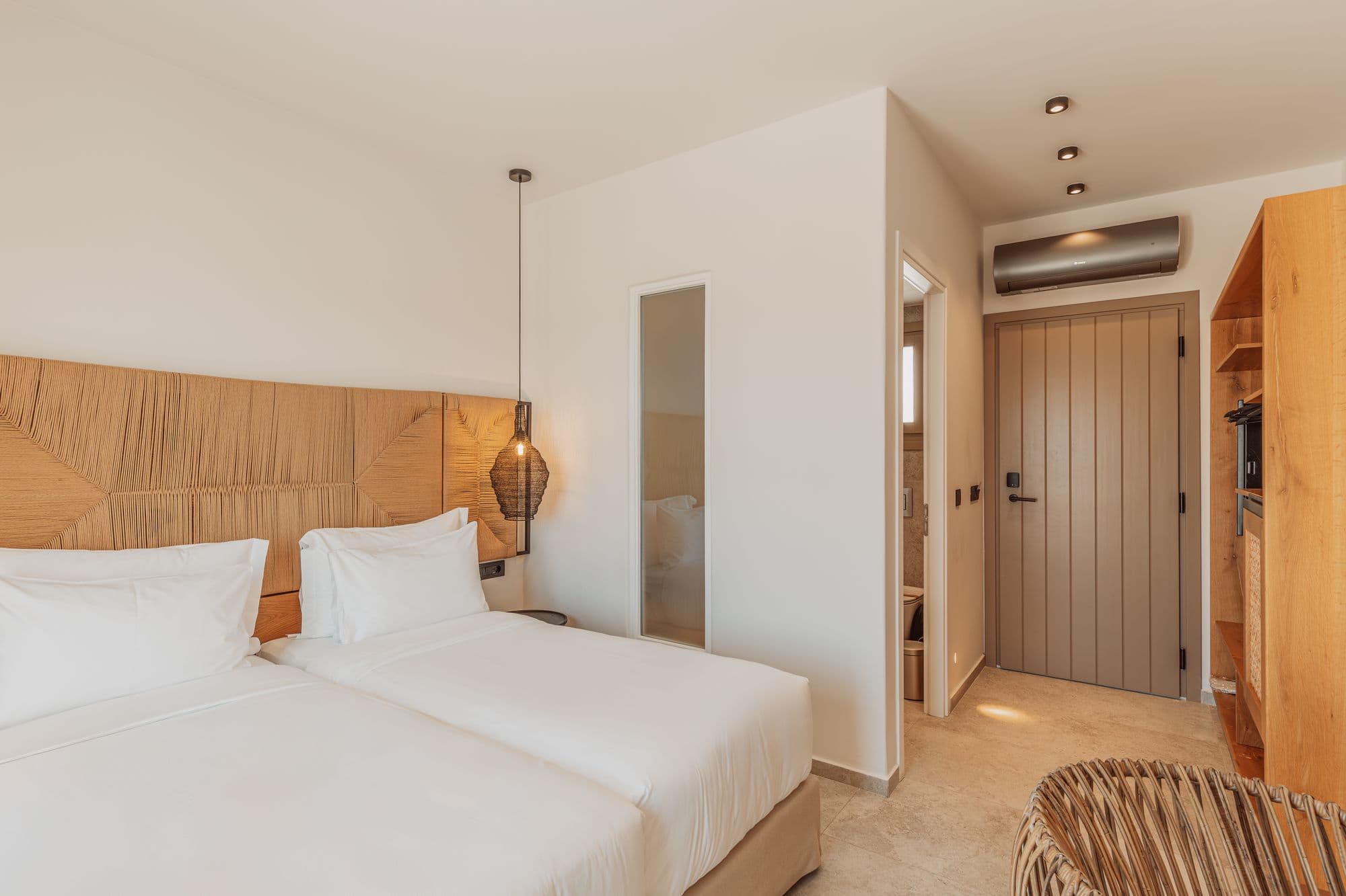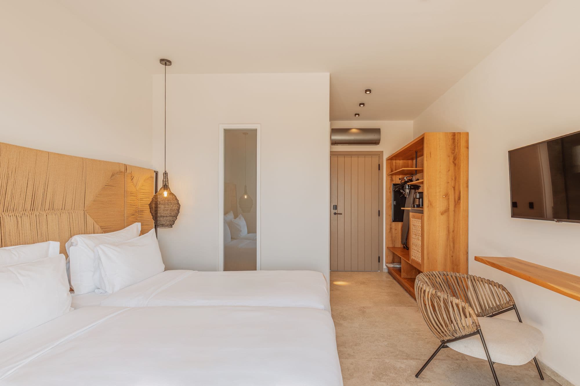Natural tones, tactile textures, and soft light create an atmosphere of effortless calm. The full-size bed invites deep rest, while the private balcony and terrace open up to the horizon.