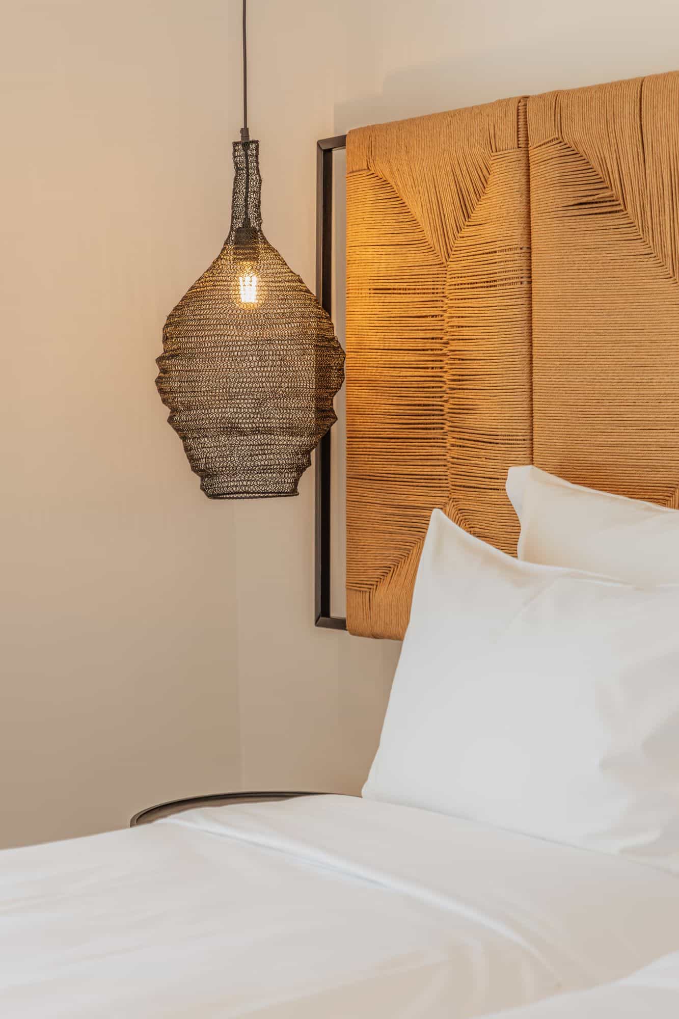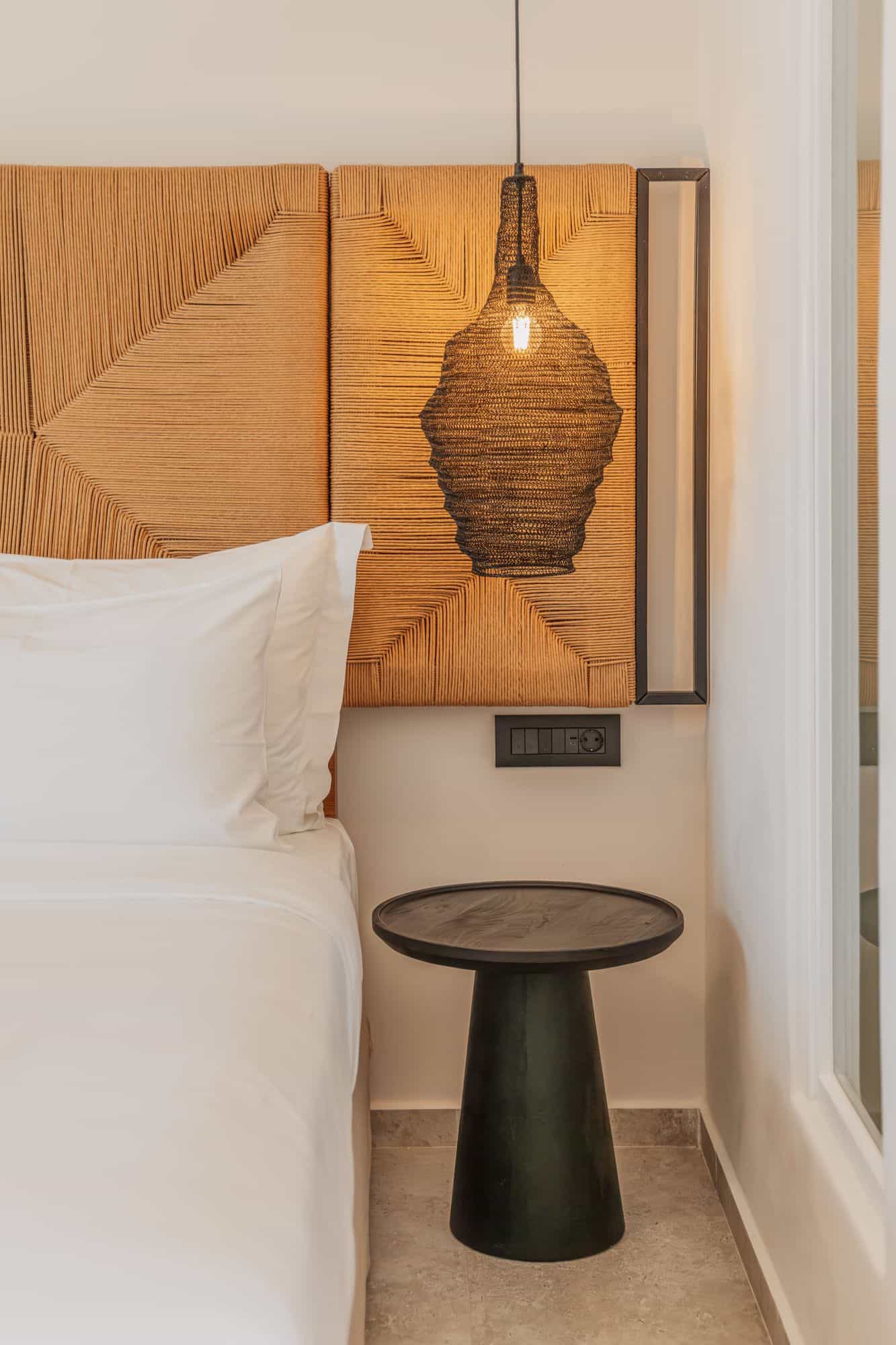 Elegant bedroom in Mykonos villa featuring a king-sized bed, stylish lighting, and relaxing interior design.