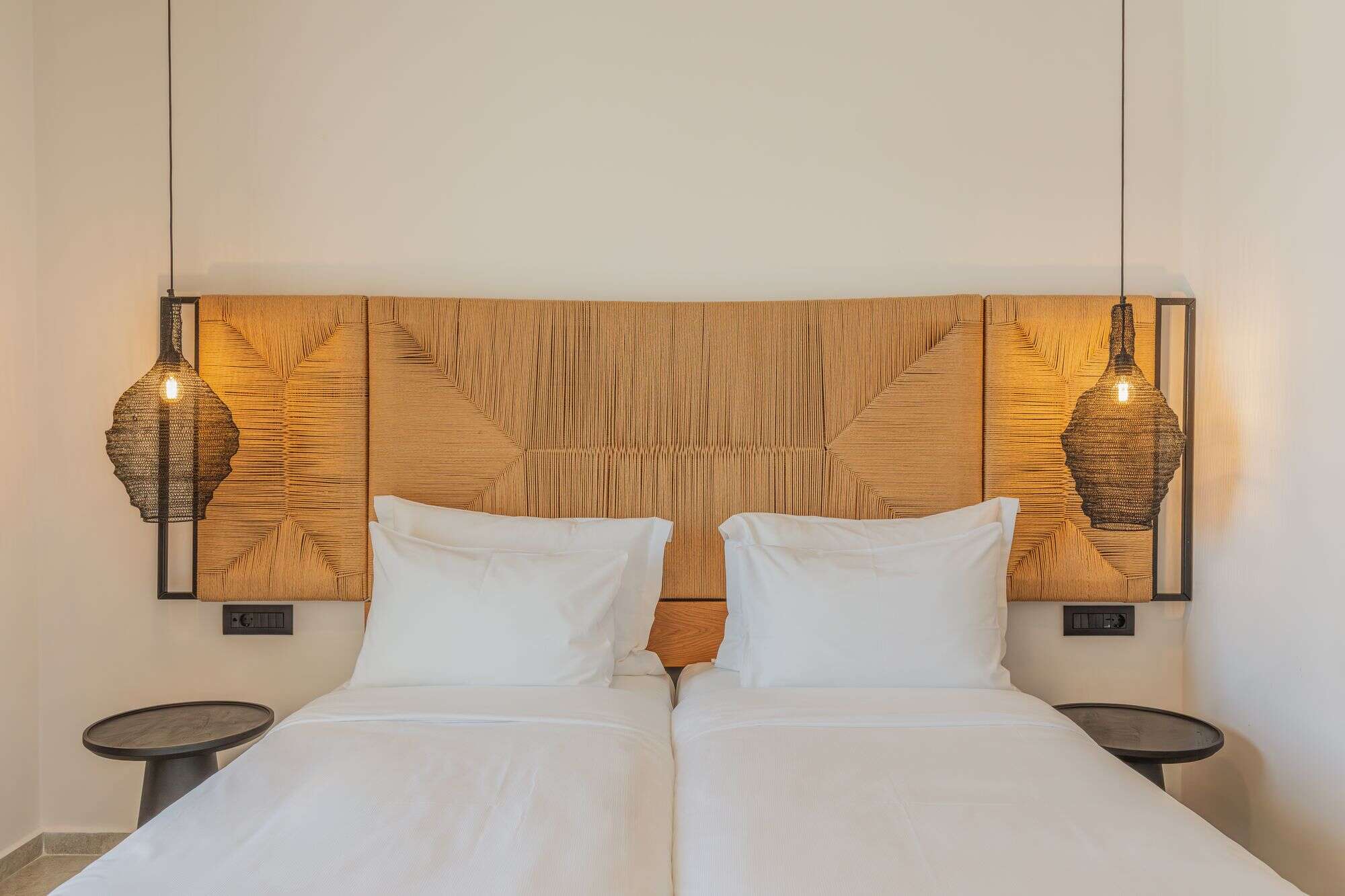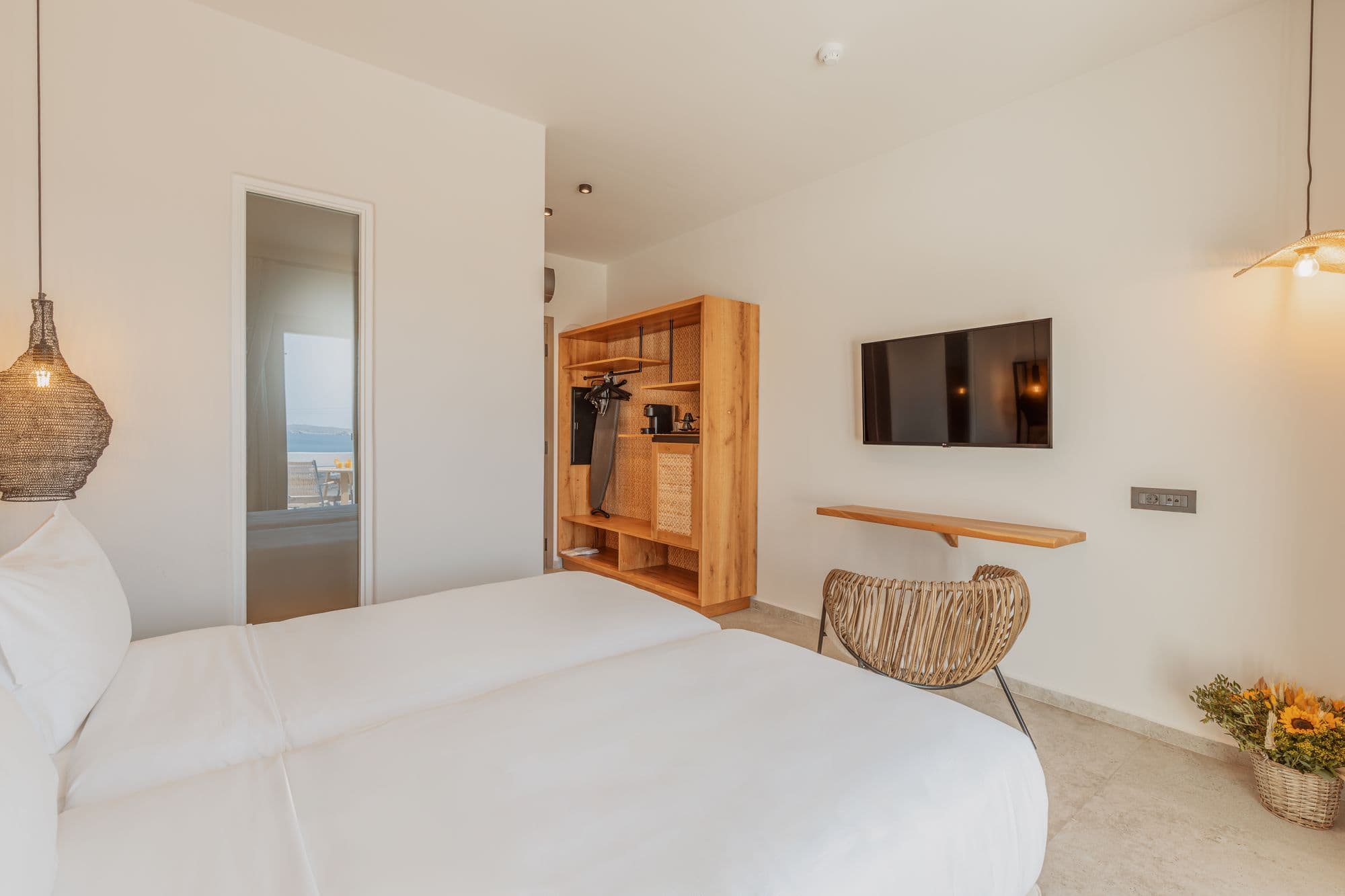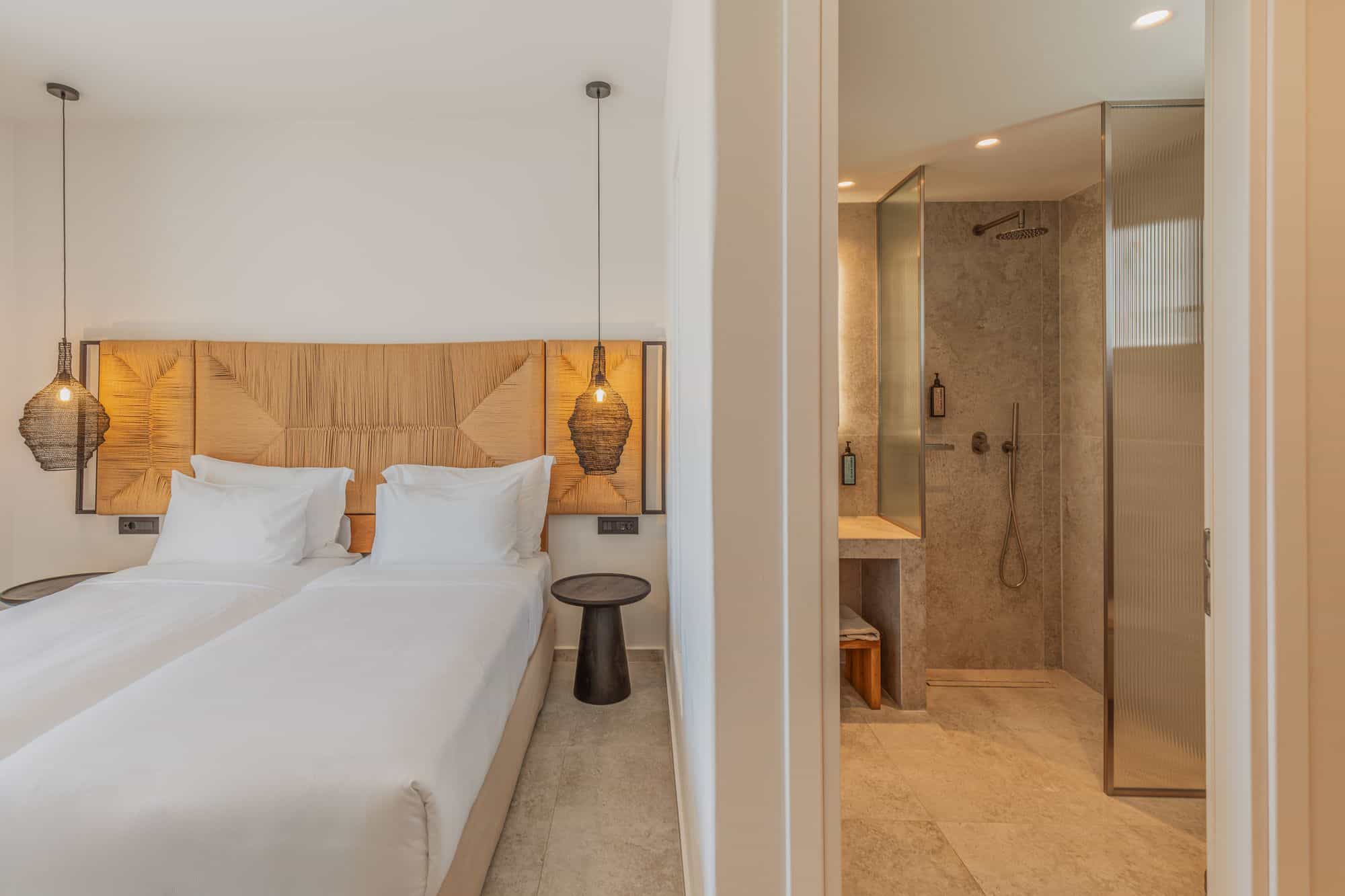 Stylish Mykonos hotel room with sea view, two beds, modern decor, and terrace access.