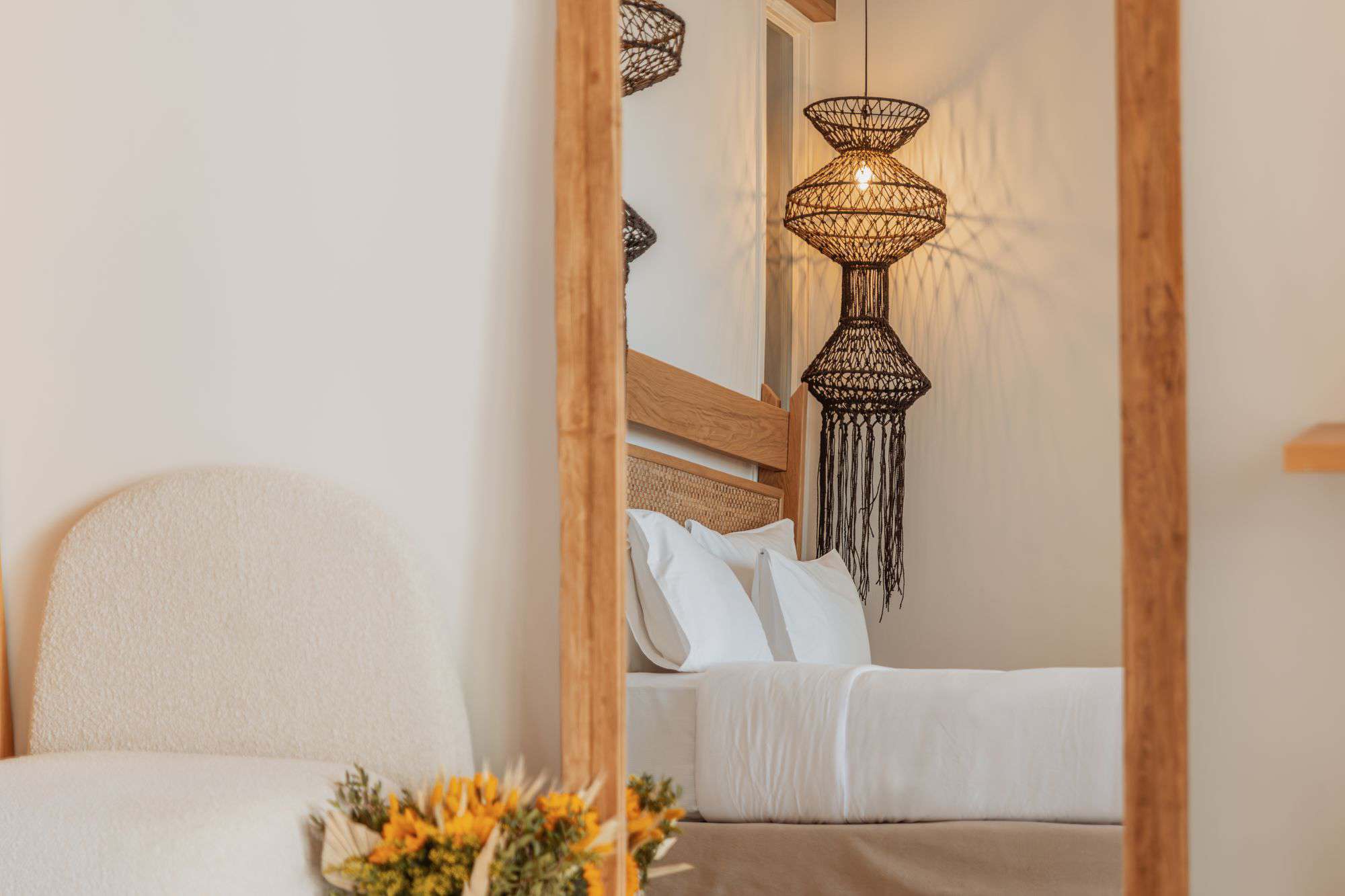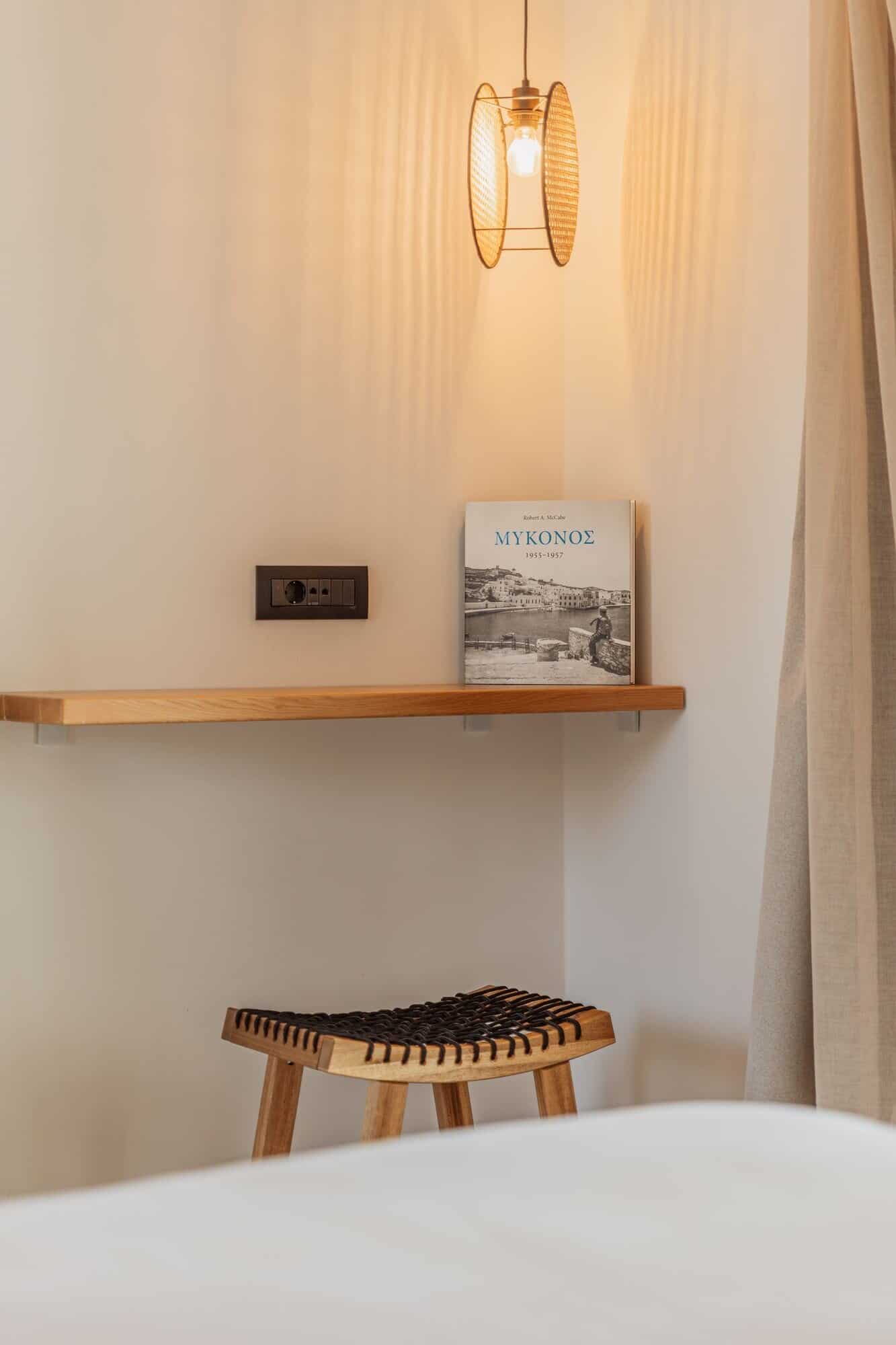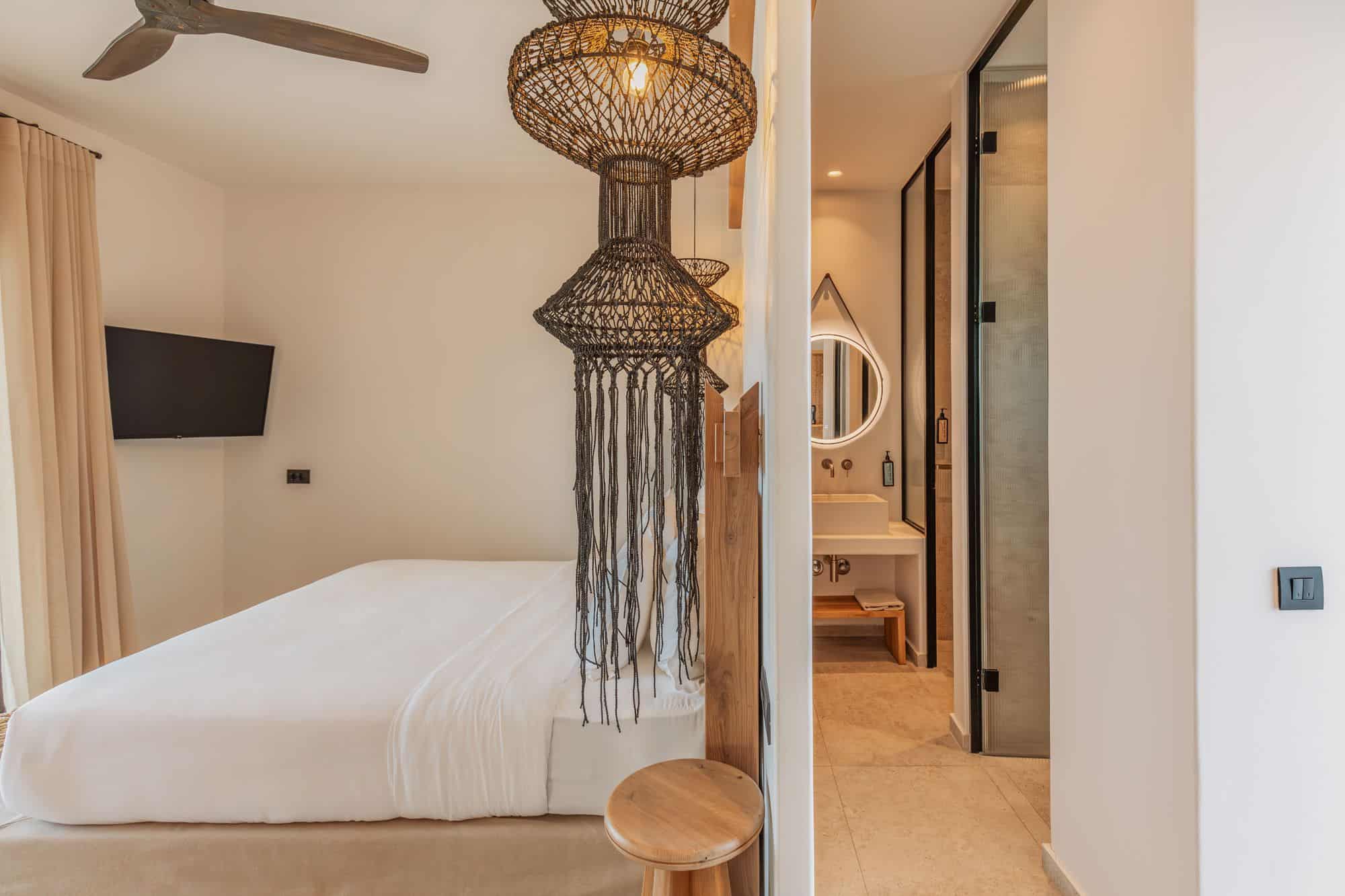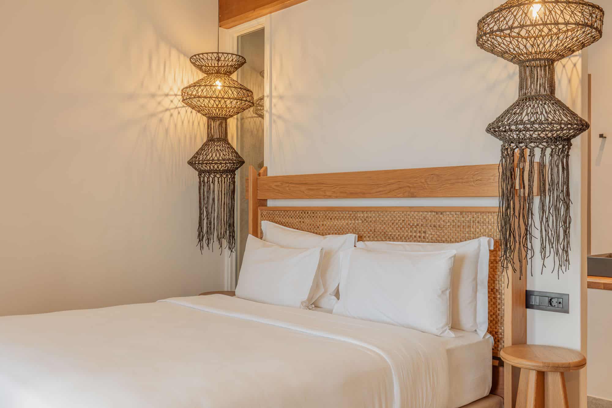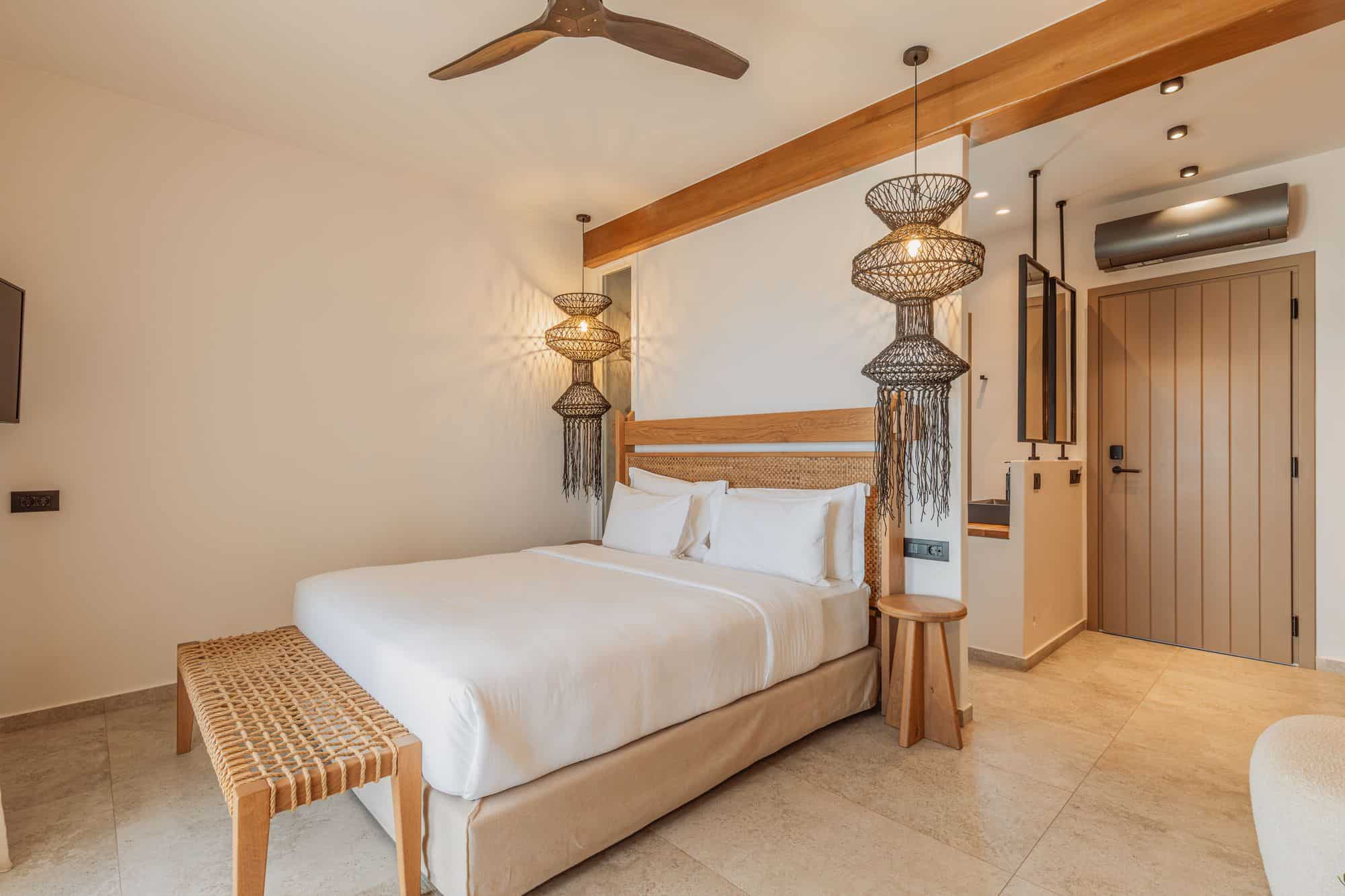 Elegant bedroom in Mykonos villa featuring a king-sized bed, stylish lighting, and relaxing interior design.
