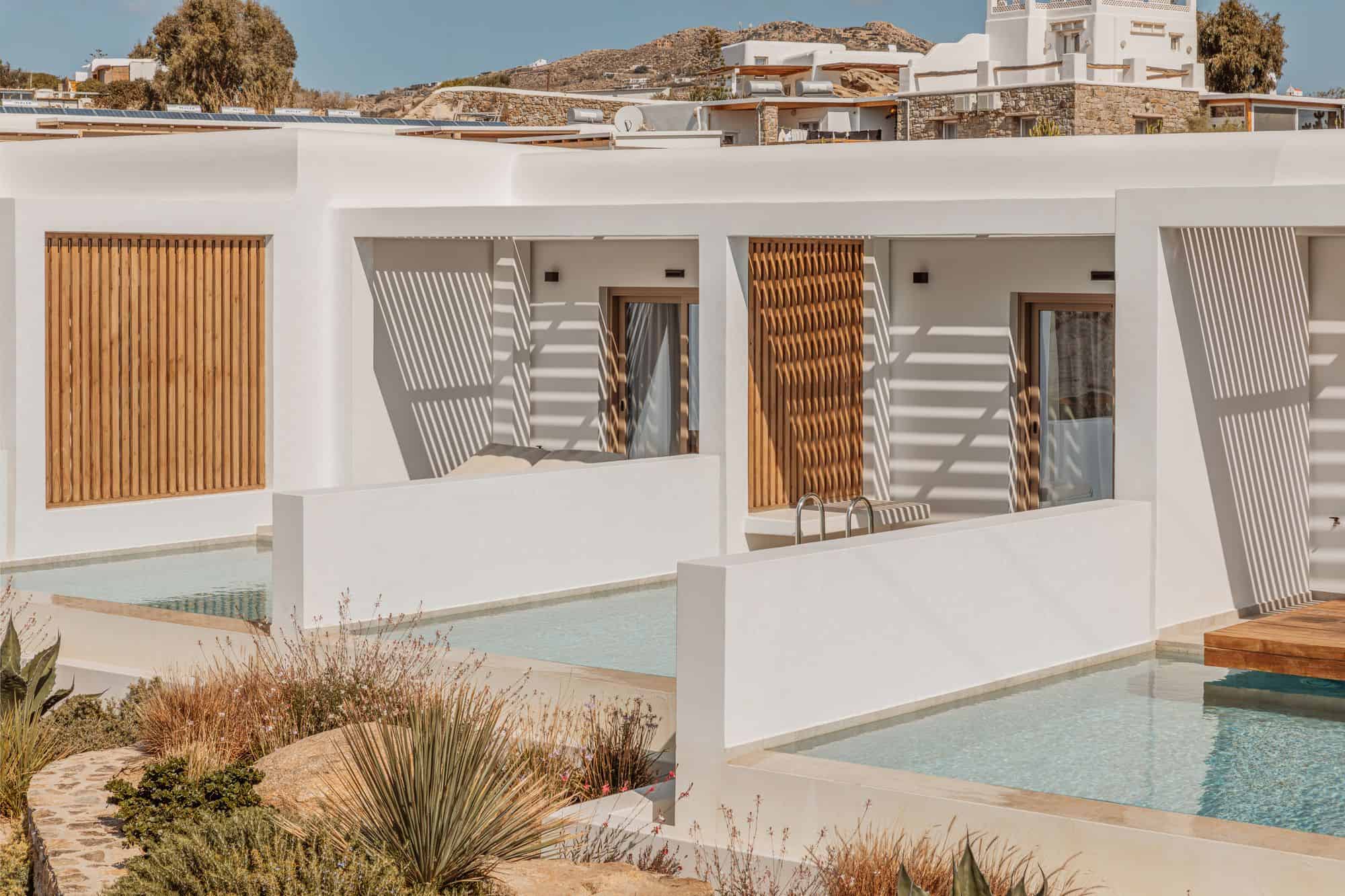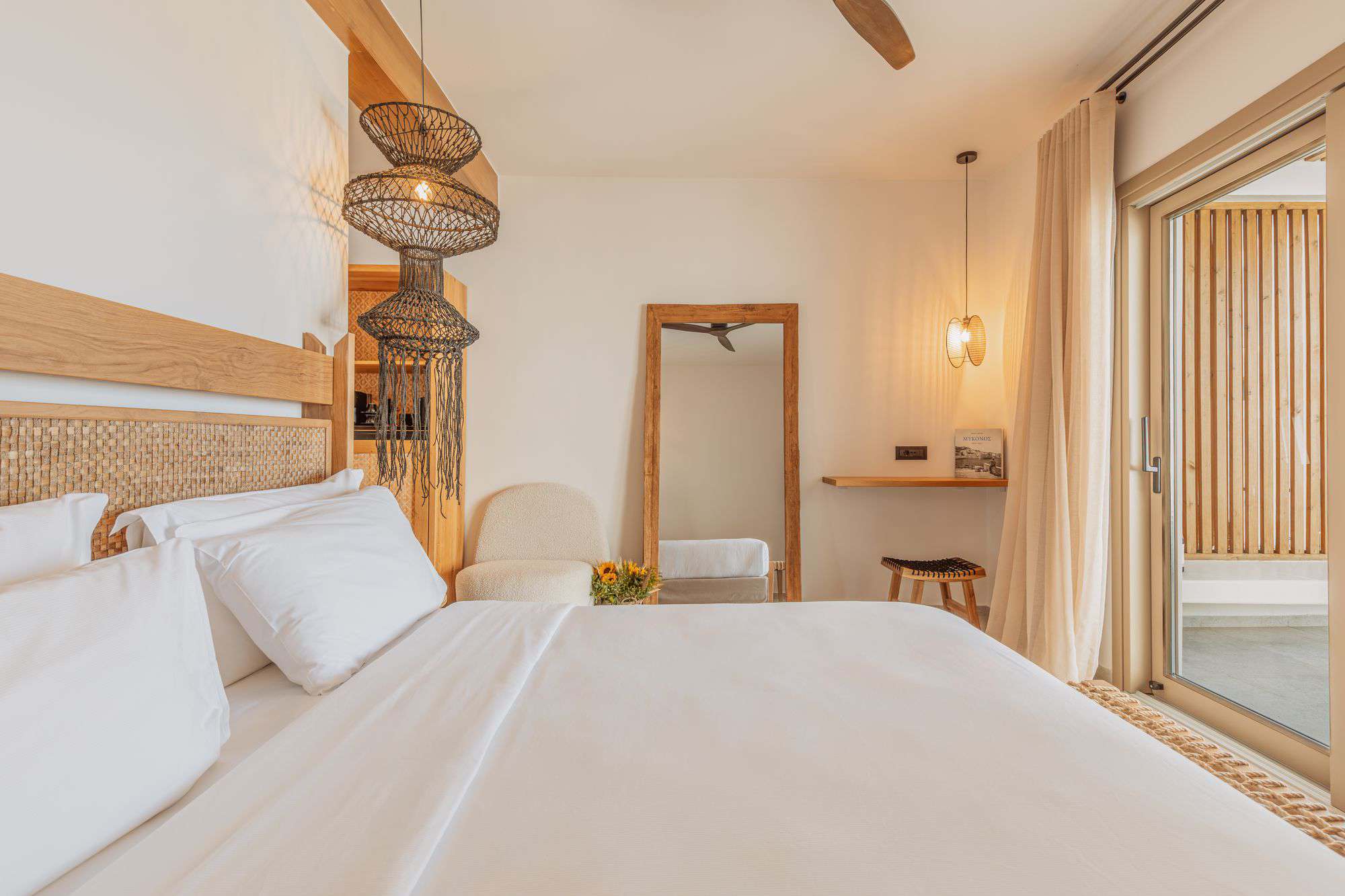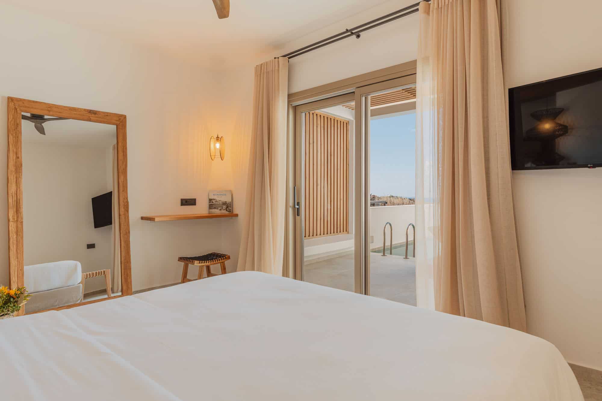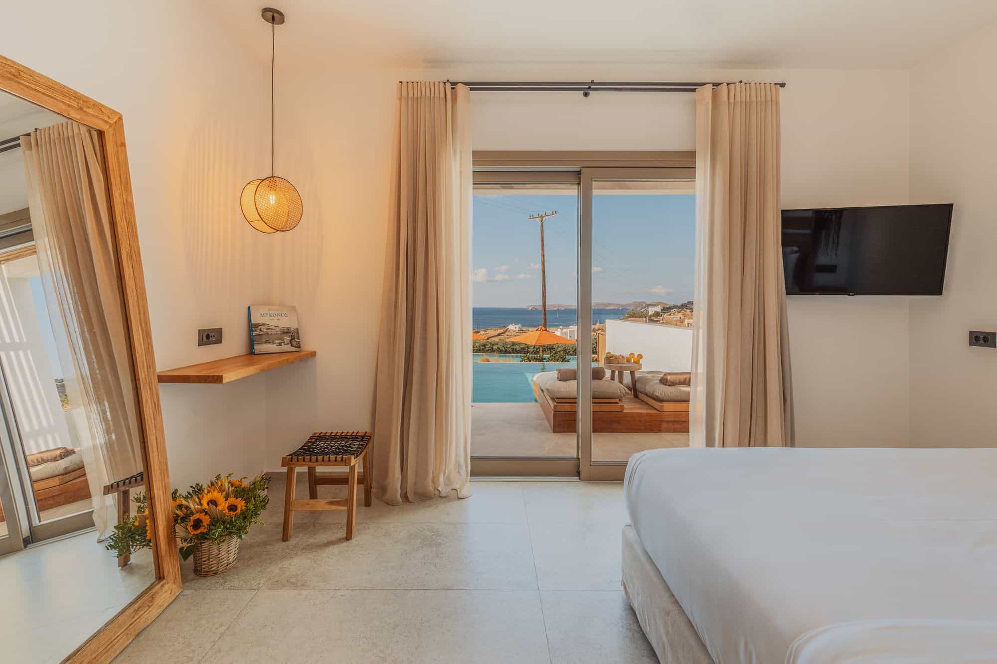 Stylish Mykonos hotel room with sea view, two beds, modern decor, and terrace access.