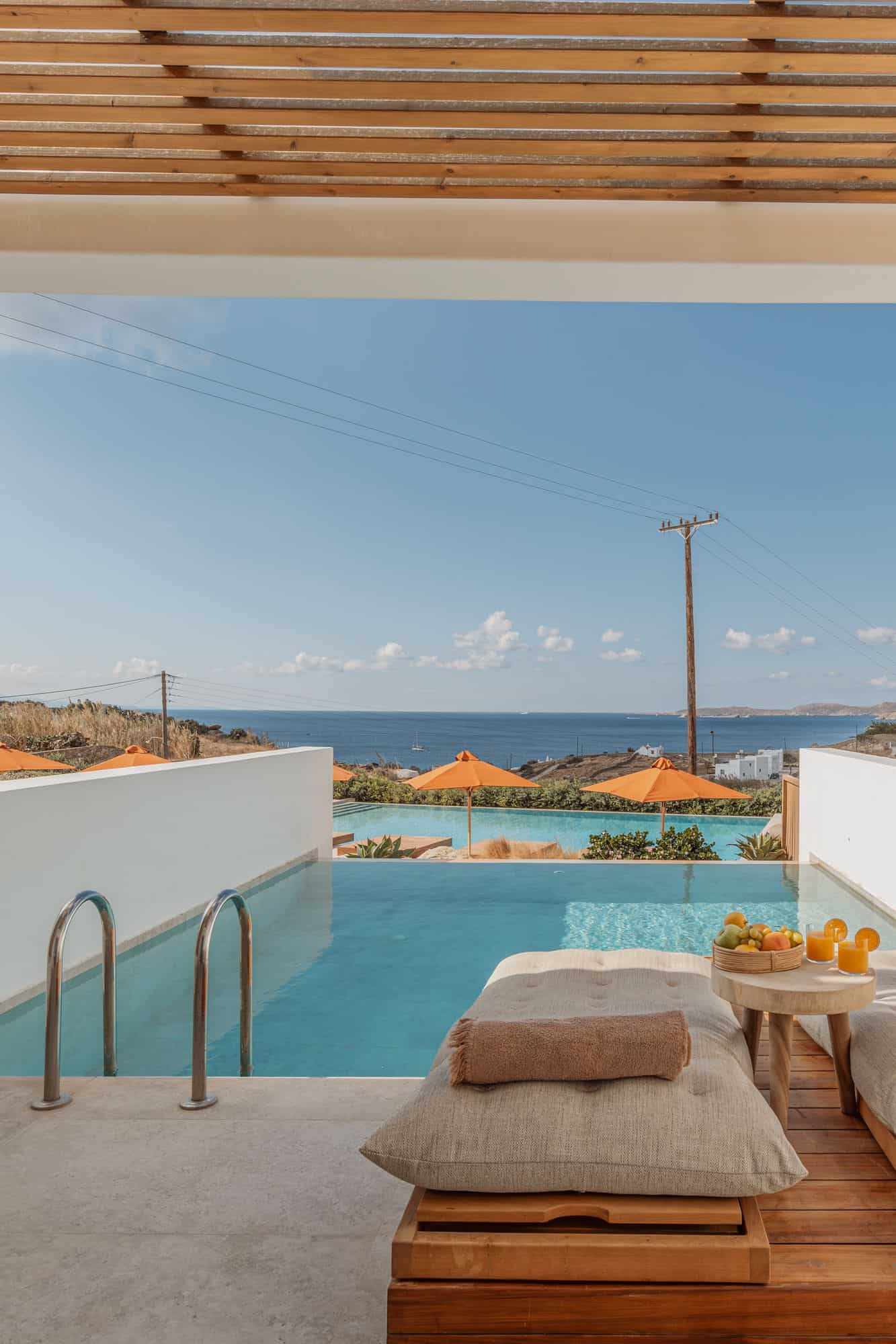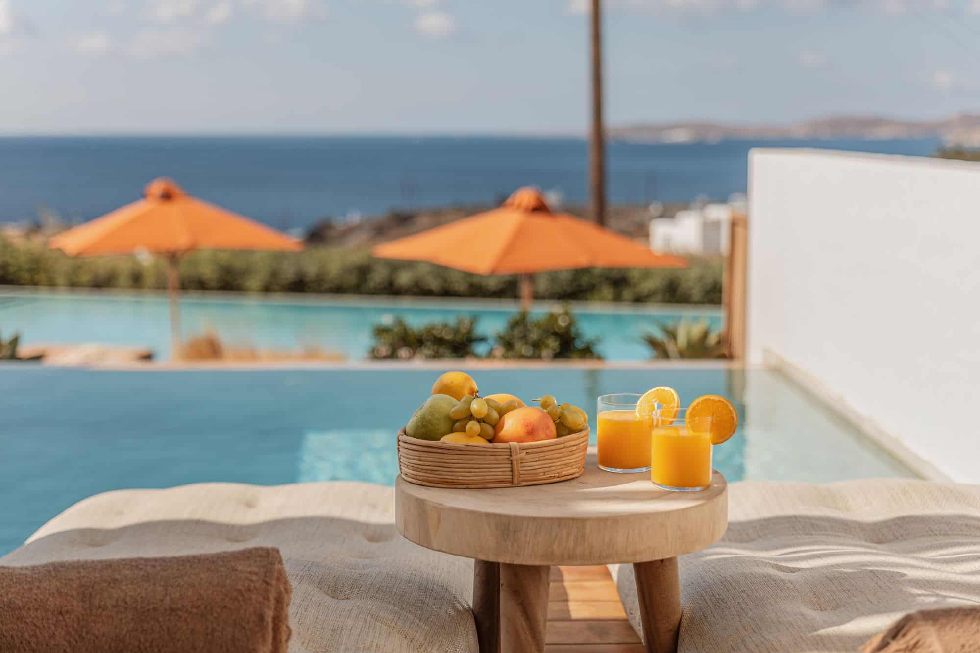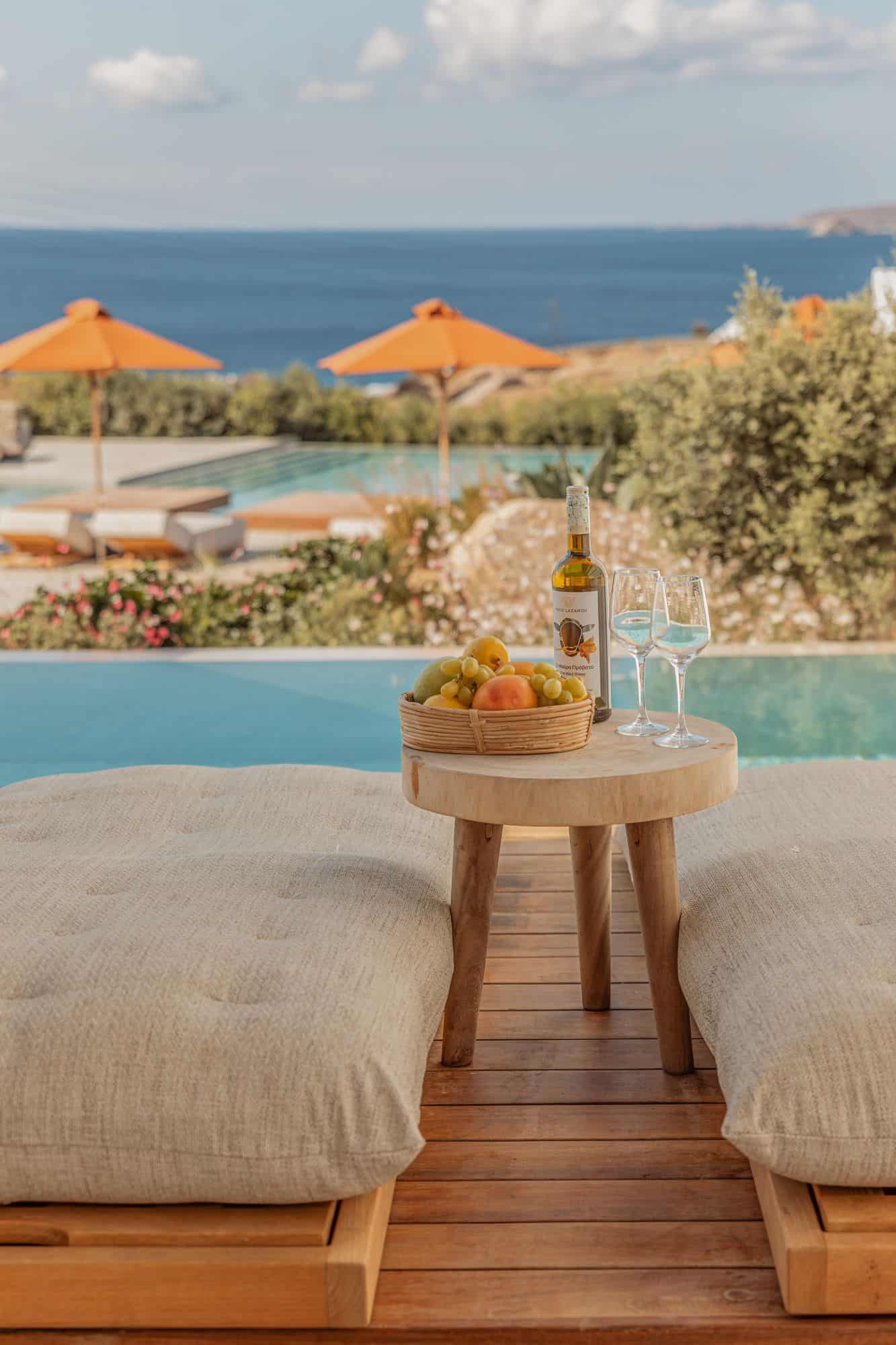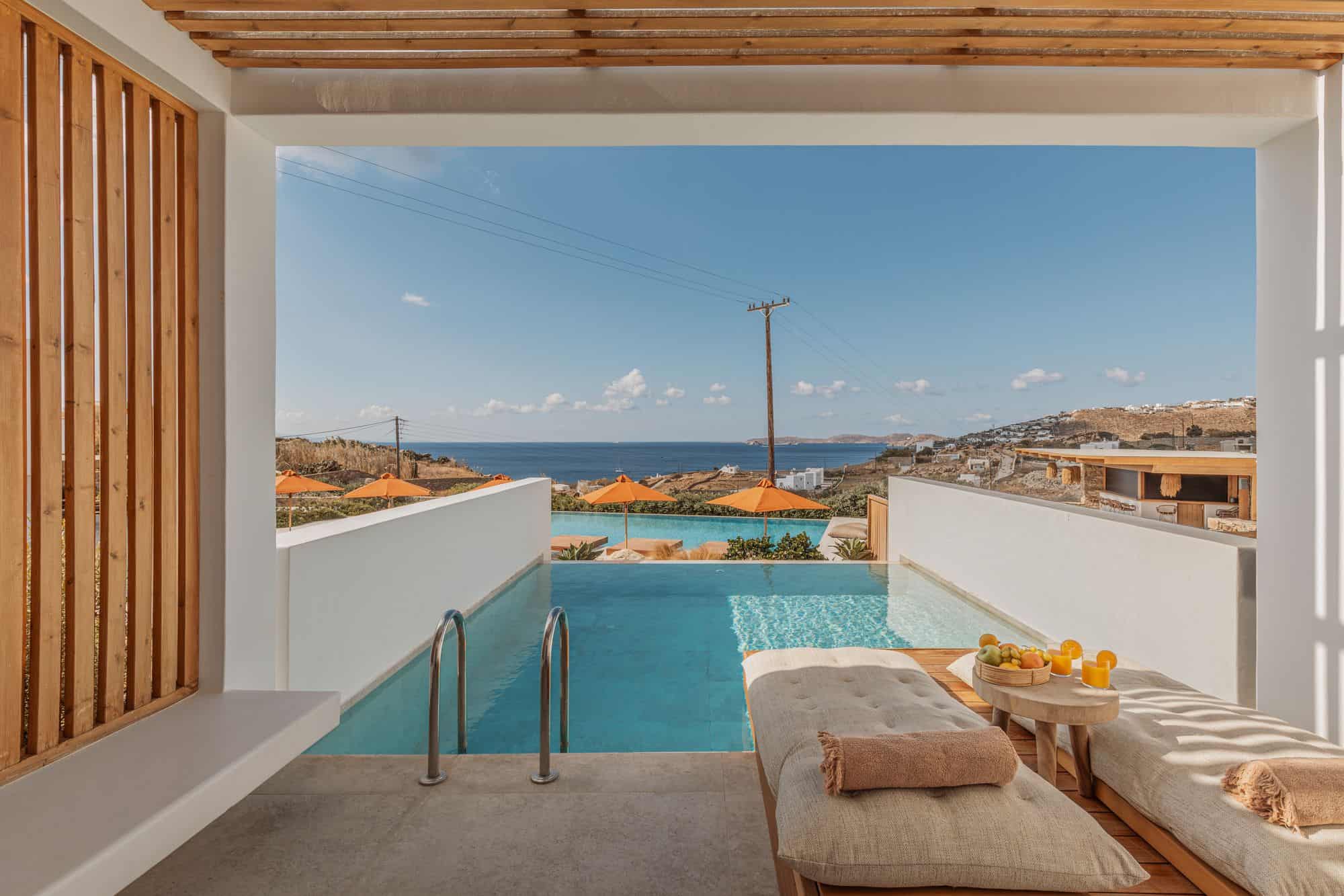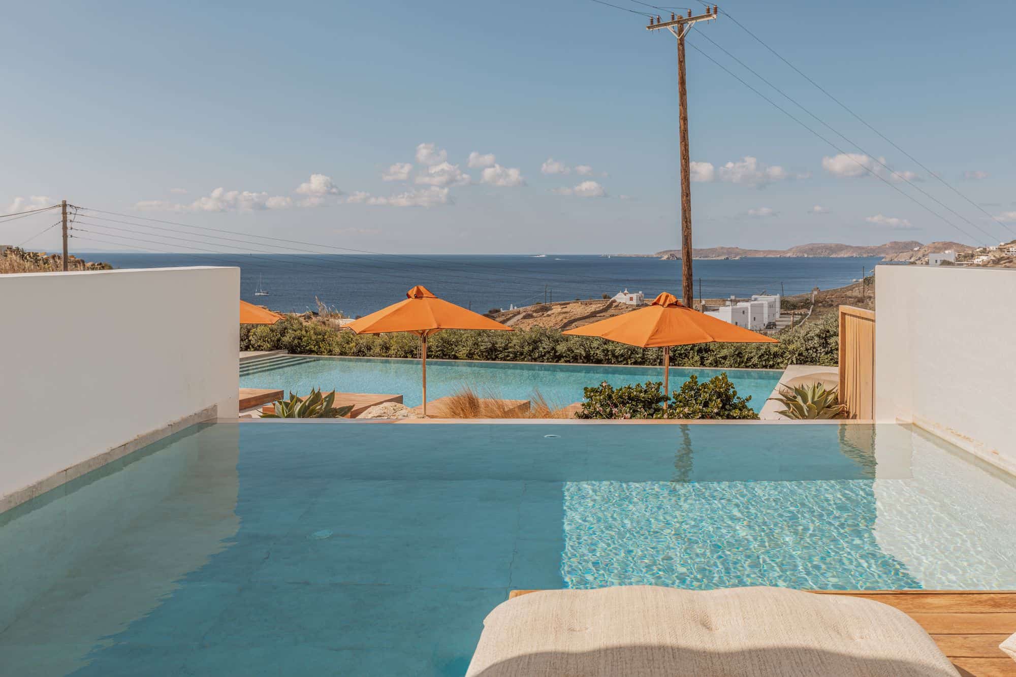 Stunning outdoor pool at Aelo Mykonos overlooking the Aegean Sea with vibrant orange umbrellas and lush landscaping.
