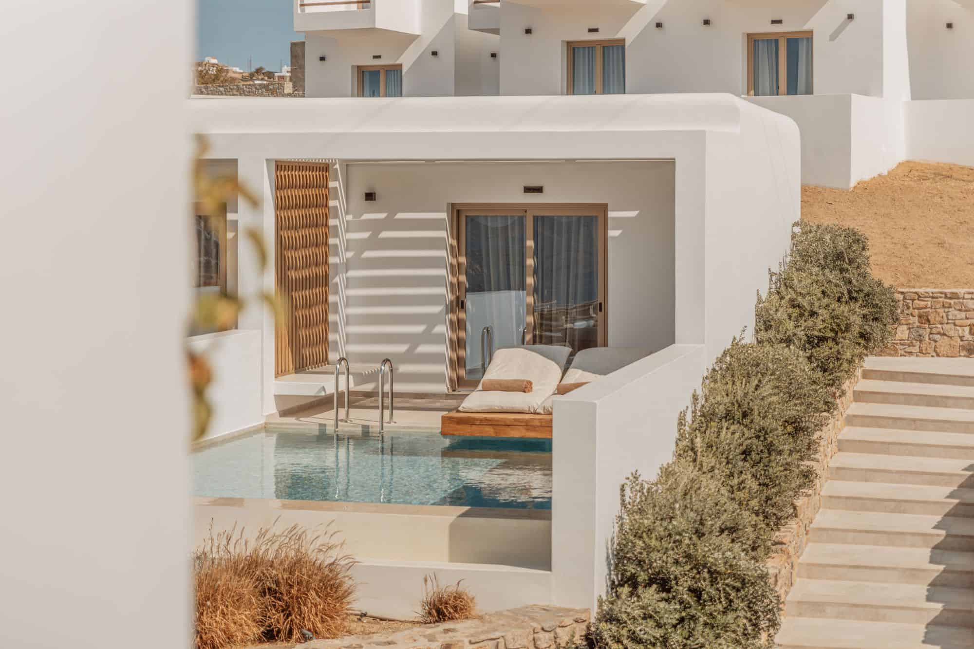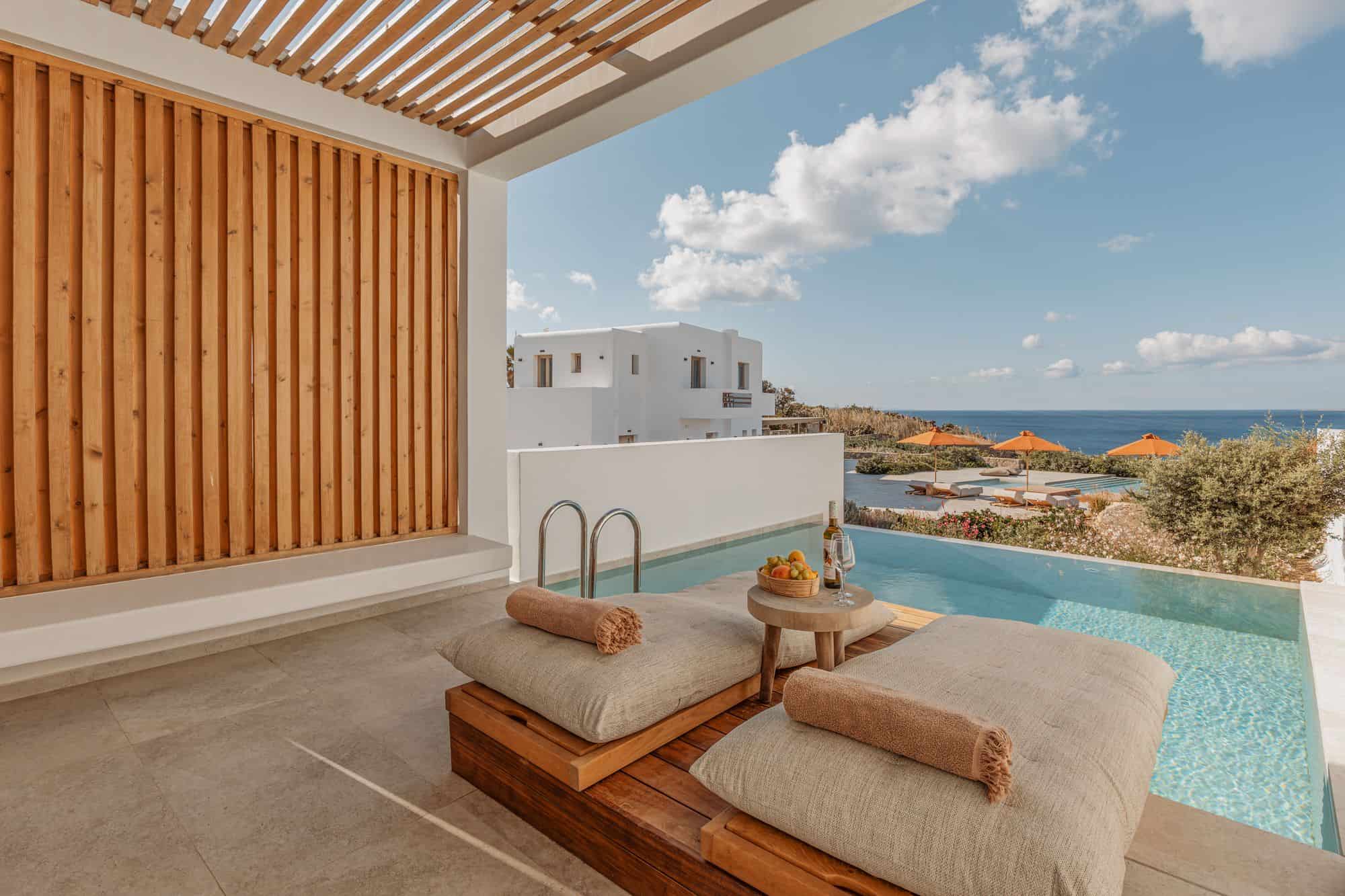 A sanctuary of pure light and silence, the Deluxe Suite with Sea View invites you into 25 m² of refined intimacy. Its defining feature: a private pool framed by clean architecture and island vegetation — a quiet corner open to the Aegean.